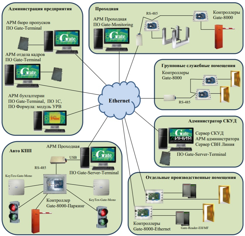 GATE-Terminal – АРМ оператора СКУД. Обеспечивает настройку и конфигурацию системы и ее элементов, организацию бюро пропусков, формирование разнообразных отчетов по событиям системы, в том числе дисциплинарные и отчеты для учета рабочего времени. Количество АРМ с ПО Gate-Terminal в системе не ограничено, минимально должен быть один.